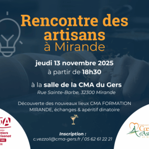 La CMA du Gers vous donne rdv le jeudi 13 novembre à 18h30 à Mirande (Rue Sainte-Barbe) ! Découverte des nouveaux lieux CMA Formation Mirande, échanges entre artisans et avec vos conseillers CMA, et apéritif dinatoire Inscription : c.vezzoli@cma-gers.fr /…